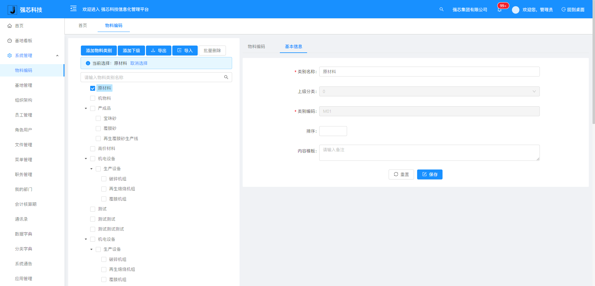系統(tǒng)設置:物料編碼、基地管理、組織架構(gòu)、員工管理、角色用戶、菜單管理、職務管理、會計核算期、授權(quán)設置