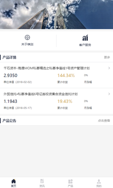 • 旗下產(chǎn)品:包括產(chǎn)品列表、凈值查看、產(chǎn)品公告三個功能模塊。