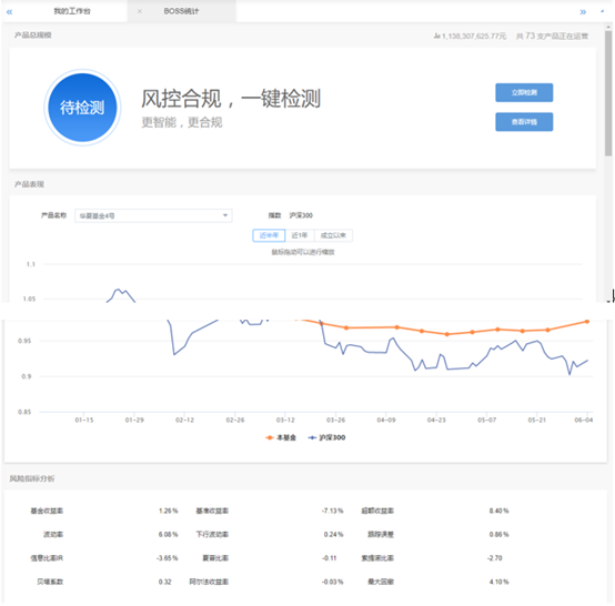 • BOSS統(tǒng)計:專門針對領(lǐng)導(dǎo)層設(shè)計的產(chǎn)品總規(guī)模、產(chǎn)品表現(xiàn)、風(fēng)險指標(biāo)分析檢測頁面。